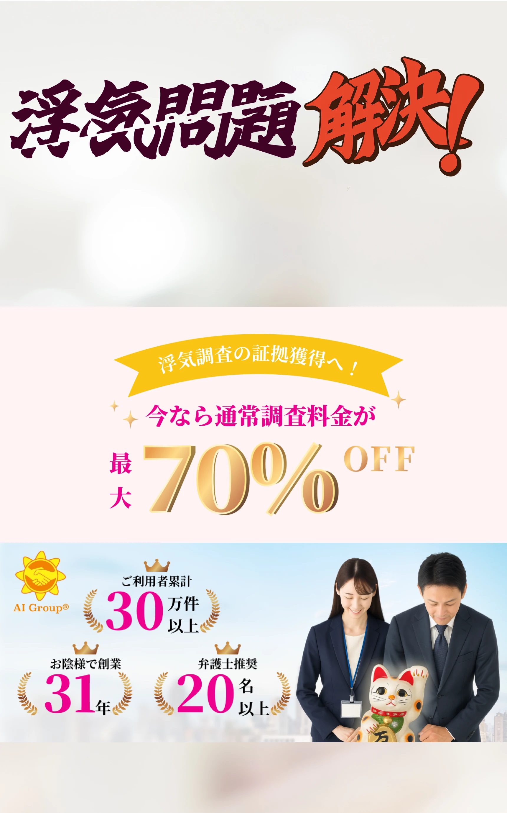 担当の相談員?の方の人柄がとてもよかったです。話しやすい雰囲気で対応してくれて安心しました。証拠もばっちりで、不安だった毎日から解放されました。本当にありがとうございました。
